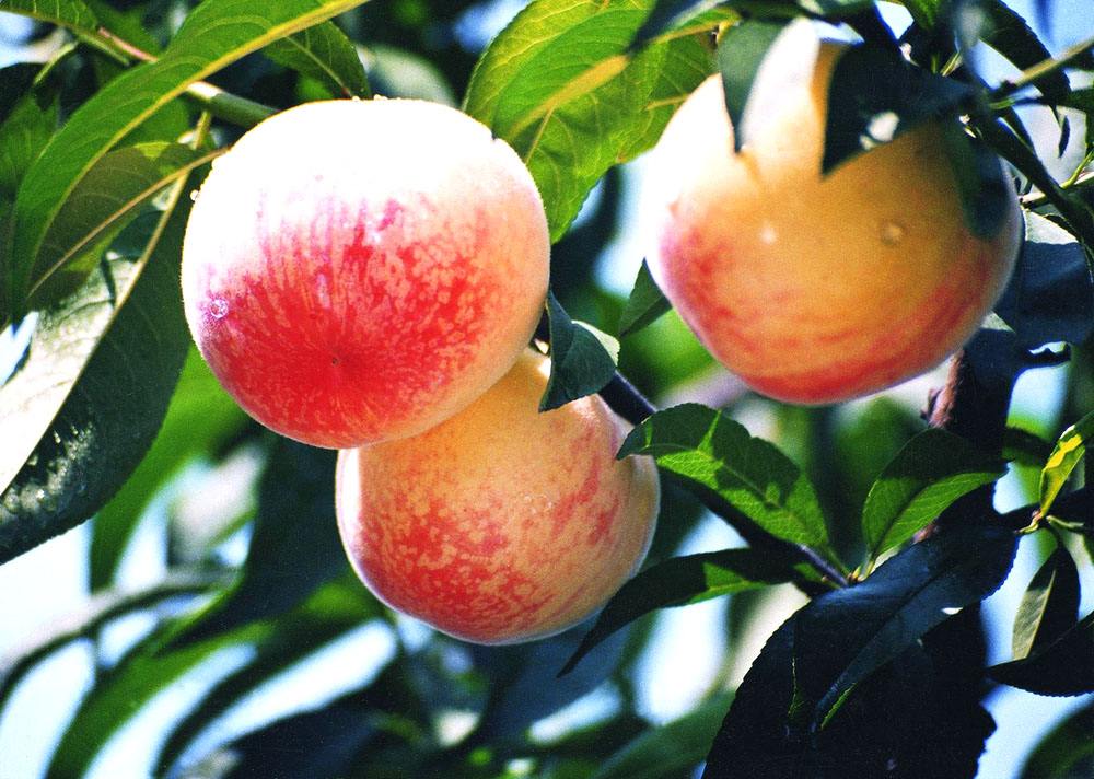 成熟的水蜜桃略呈球形,表面裹著一層細小的絨毛,青里泛白,白里透紅。一個桃子一般重一百克到二百克,大的重三百多克。水蜜桃皮很薄,果肉豐富,宜于生食,入口滑潤不留渣子。剛熟的桃子硬而甜,熟透的桃子軟而多汁,吃時宜輕輕拿起,小心地把皮撕下去;這樣的果品,對于老年人和牙齒不好的人來說,是難得的夏令珍品.吃剩下的核就是水蜜桃的種子,外殼呈長扁形,兩端稍尖,表面疙疙瘩瘩的,比較硬。核由兩片合成,敲開便可看到桃仁。桃仁可以吃,也可以入藥。